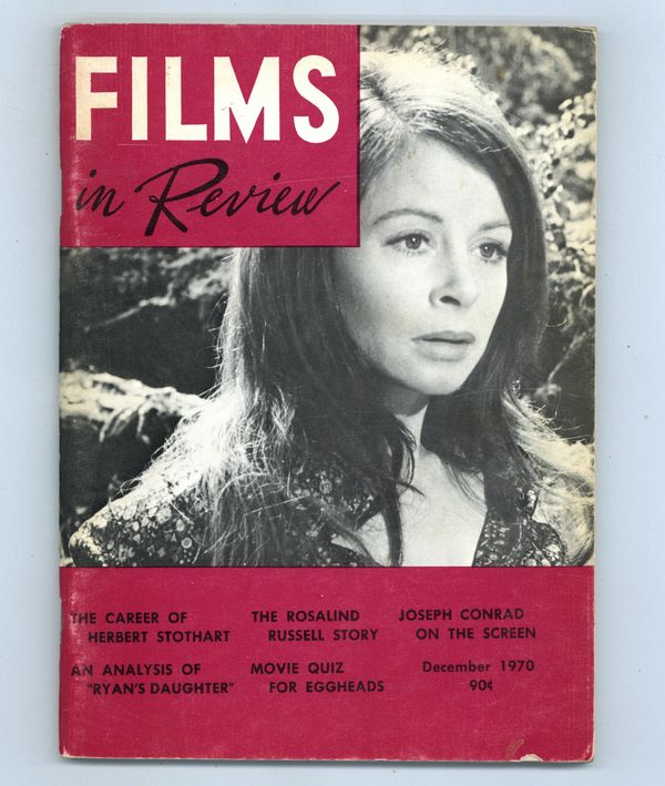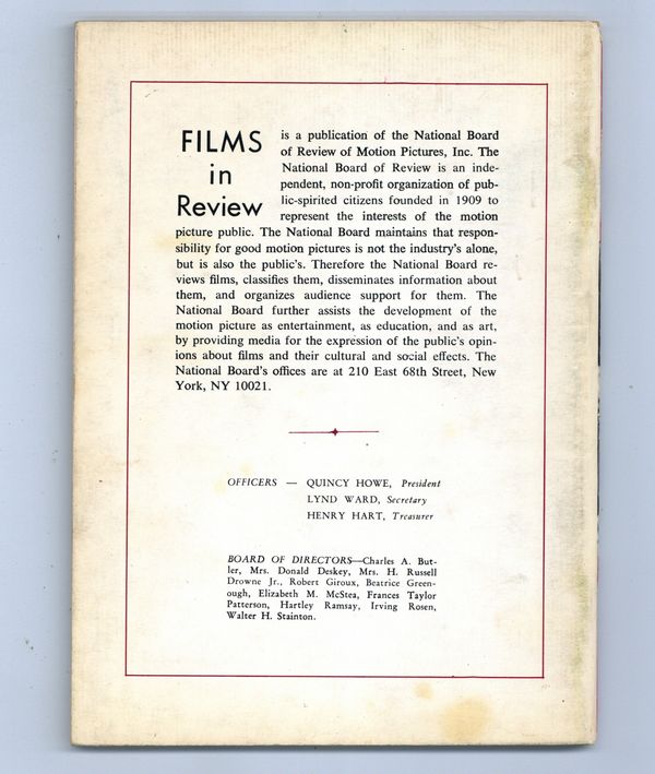 Published Dec 1970 by National Board of Review of Motion Pictures Inc..$10.00Film in Review is a publication of the National Board of Review of Motion Pictures, Inc, an independent, non-profit organization of public citizens founded in 1909 to represent the interests of the motion picture public. This National Board further assists the development of the motion picture as a source of entertainment, as education, and as art, by providing media for the expression of the public's opinion about films and their cultural and social effects. 5 1/2-in. x 7 1/2-in., 72 pages, B&W. Cover price $0.90.