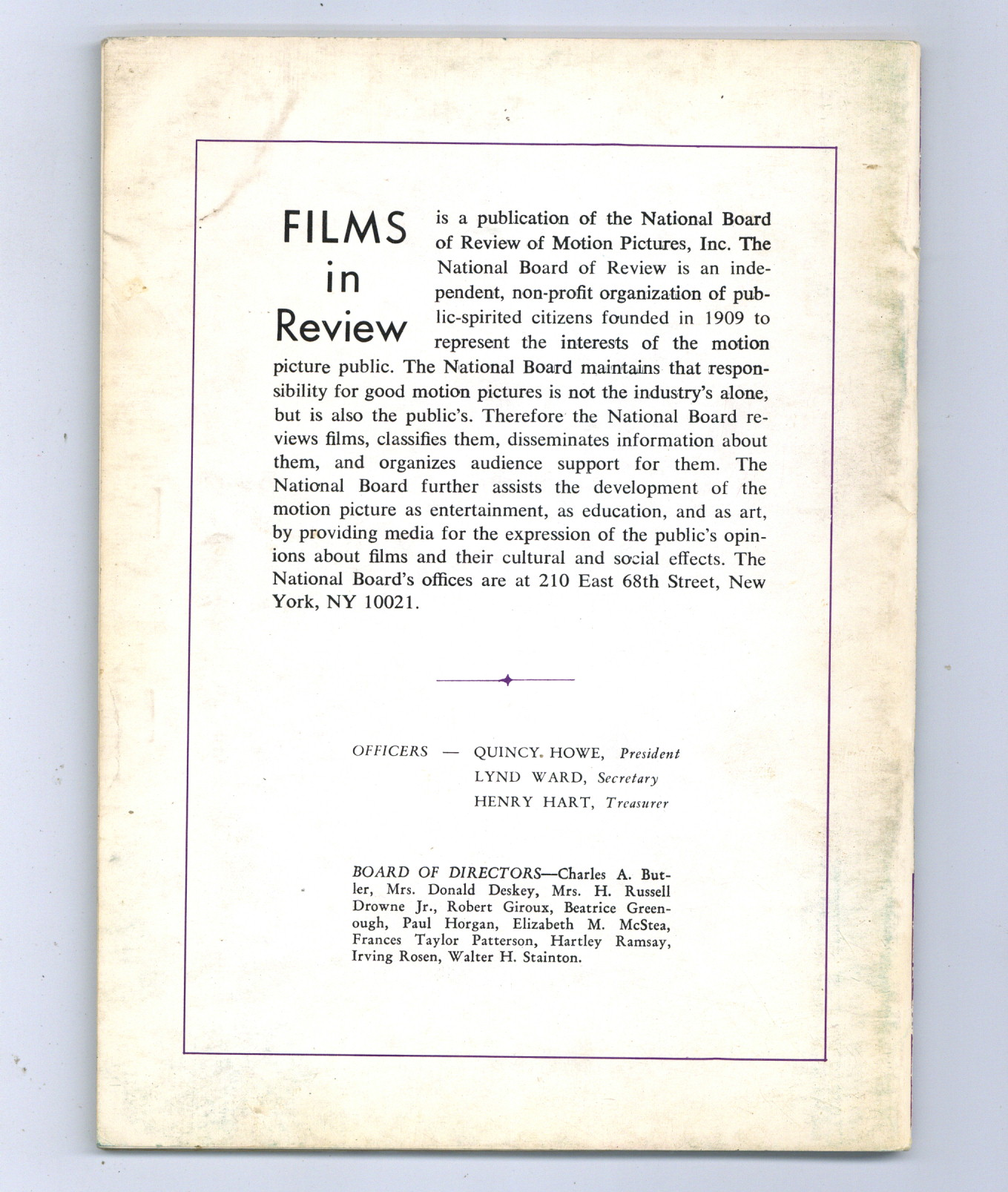Film in Review is a publication of the National Board of Review of Motion Pictures, Inc, an independent, non-profit organization of public citizens founded in 1909 to represent the interests of the motion picture public. This National Board further assists the development of the motion picture as a source of entertainment, as education, and as art, by providing media for the expression of the public's opinion about films and their cultural and social effects. 5 1/2-in. x 7 1/2-in., 64 pages, B&W. Cover price $0.90.