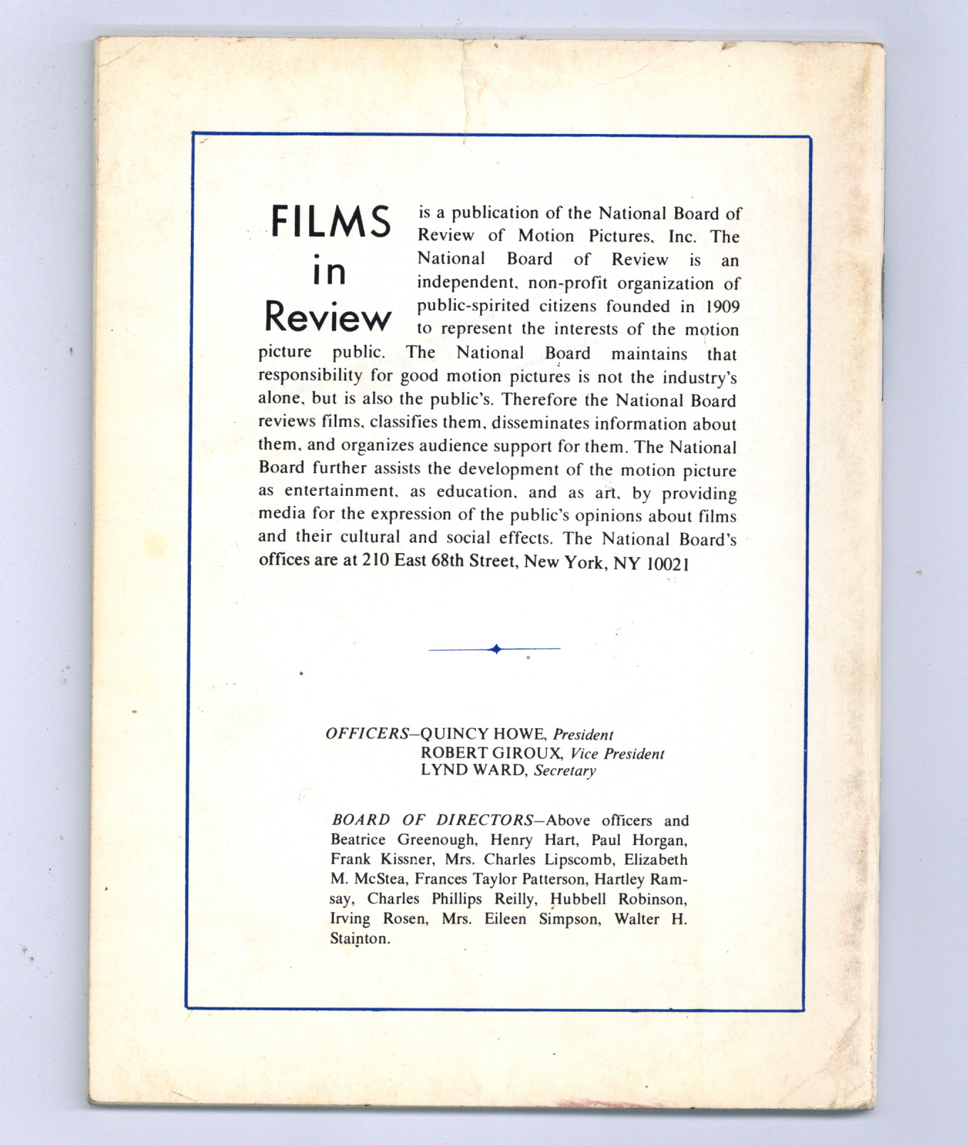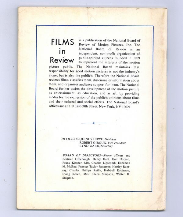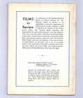 Film in Review is a publication of the National Board of Review of Motion Pictures, Inc, an independent, non-profit organization of public citizens founded in 1909 to represent the interests of the motion picture public. This National Board further assists the development of the motion picture as a source of entertainment, as education, and as art, by providing media for the expression of the public's opinion about films and their cultural and social effects. 5 1/2-in. x 7 1/2-in., 64 pages, B&W. Cover price $1.25.