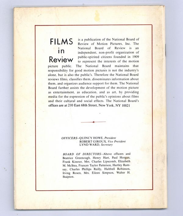 Film in Review is a publication of the National Board of Review of Motion Pictures, Inc, an independent, non-profit organization of public citizens founded in 1909 to represent the interests of the motion picture public. This National Board further assists the development of the motion picture as a source of entertainment, as education, and as art, by providing media for the expression of the public's opinion about films and their cultural and social effects. 5 1/2-in. x 7 1/2-in., 64 pages, B&W. Cover price $1.25.
