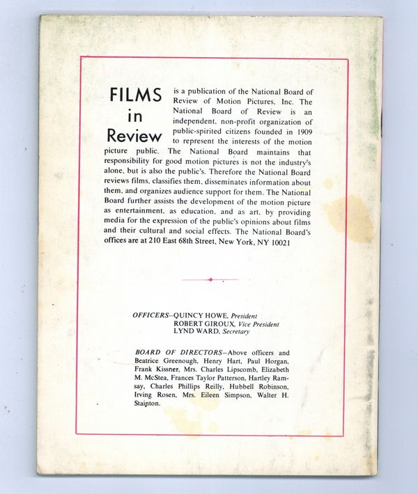 Film in Review is a publication of the National Board of Review of Motion Pictures, Inc, an independent, non-profit organization of public citizens founded in 1909 to represent the interests of the motion picture public. This National Board further assists the development of the motion picture as a source of entertainment, as education, and as art, by providing media for the expression of the public's opinion about films and their cultural and social effects. 5 1/2-in. x 7 1/2-in., 64 pages, B&W. Cover price $1.25.