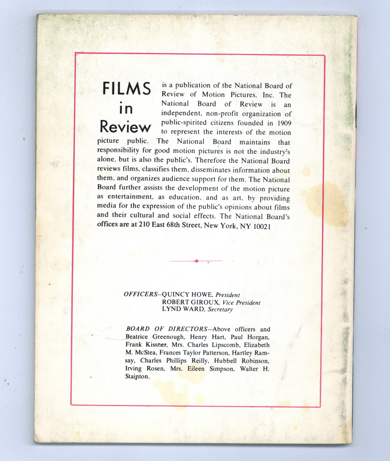 Published Sep 1974 by National Board of Review of Motion Pictures Inc..$12.75- Staple rust: Slight.