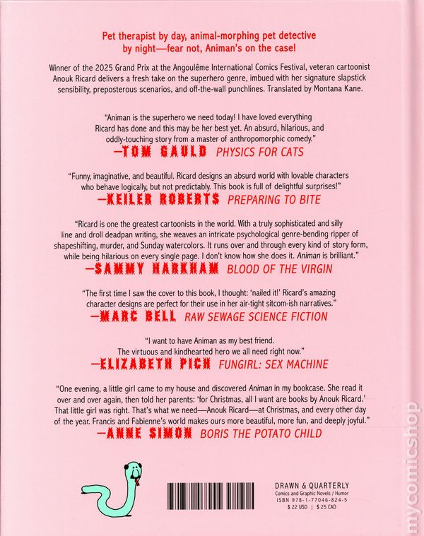 1st printing. Story and art by Anouk Ricard. Pet therapist by day, animal-morphing pet detective by night—fear not, Animans on the case! A radioactive mosquito bite as a baby gives Francis the superpower of morphing into any animal at will. Learning to keep his powers secret from an early age, Francis takes up pet therapy as his day job, the perfect cover for his secret identity as Animan. Francis uses his fantastical gift to treat his animal patients, go undercover to solve murders, and battle it out with his nemesis, Objecto, a man capable of transforming into any and every possible object. And to top it all off, in his free time Francis is an avid watercolorist, who enjoys drawing landscapes and risqué portraits of his frog girlfriend, Fabienne. Veteran cartoonist Anouk Ricard delivers a fresh take on the superhero genre, imbued with her signature slapstick sensibility, preposterous scenarios, and off-the-wall punchlines. Translated by Montana Kane. Hardcover, 7 1/2-in. x 9 1/2-in., 80 pages, full color. Teen+ Cover price $24.00.