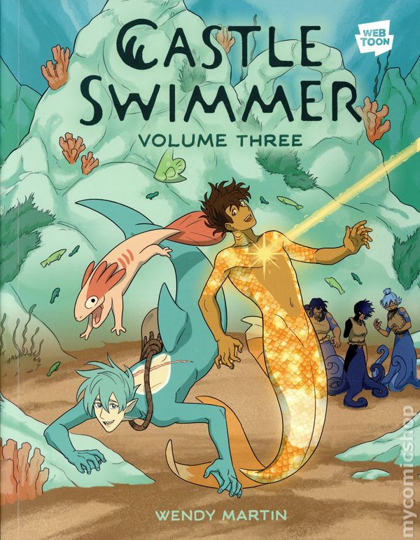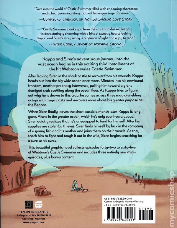 Volume 3 - 1st printing. Collects Webtoon's Castle Swimmer Season 1: Episodes 42-65. Story and art by Wendy Martin. Kappa and Siren's adventurous journey into the vast ocean begins in this exciting third installment of the hit Webtoon series Castle Swimmer. After leaving Siren to recover from his wounds in the shark castle, Kappa heads out into the big wide ocean once more. Minutes into his newfound freedom, another prophecy intervenes, pulling him towards a giant demigod crab scuttling along the ocean floor. As Kappa tries to figure out why he is drawn towards this crab, he comes across three magic-wielding octopi with tragic pasts and uncovers more about his greater purpose as the Beacon. When Siren finally leaves the shark castle a month later, Kappa is long gone. Alone in the greater ocean, which he's only ever heard about, Siren quickly realizes that he's unequipped to fend for himself. After his supplies are stolen by thieves, Siren finds himself by luck in the company of a young fish and his mother and joins them on their travels. As they teach him to fight and tough it out in the wild, Siren begins searching for a cure to his curse. This beautiful graphic novel collects episodes 42-65 of Webtoon's Castle Swimmer and includes three new mini-episodes, plus exclusive bonus content. Softcover, 7-in. x 9-in., 288 pages, full color. Cover price $18.99.