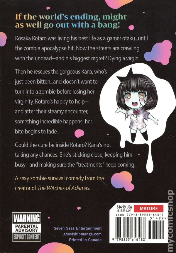 Volume 1 - 1st printing. Story and art by Yu Imai. Translated by Zhan Gao. Not even a zombie apocalypse can slow down a teenagers libido! One teen discovers he may just have the cure to a mysterious outbreak in this fun and sexy survival manga. From the creator of The Witches of Adamas–also available from Seven Seas! Kosaka Kotaro was living his best life as a gamer otaku…until the zombie apocalypse hit. Now the streets are crawling with the undead—and his biggest regret? Dying a virgin. Then he rescues the gorgeous Kana, whos just been bitten…and doesnt want to turn into a zombie before losing her virginity. Kotaros happy to help—and after their steamy encounter, something incredible happens: her bite begins to fade. Could the cure be inside Kotaro? Kanas not taking any chances. Shes sticking close, keeping him busy—and making sure the treatments keep coming. A sexy zombie survival comedy from the creator of The Witches of Adamas. Softcover, 5-in. x 7-in., 198 pages, B&W. Mature Readers Cover price $14.99.