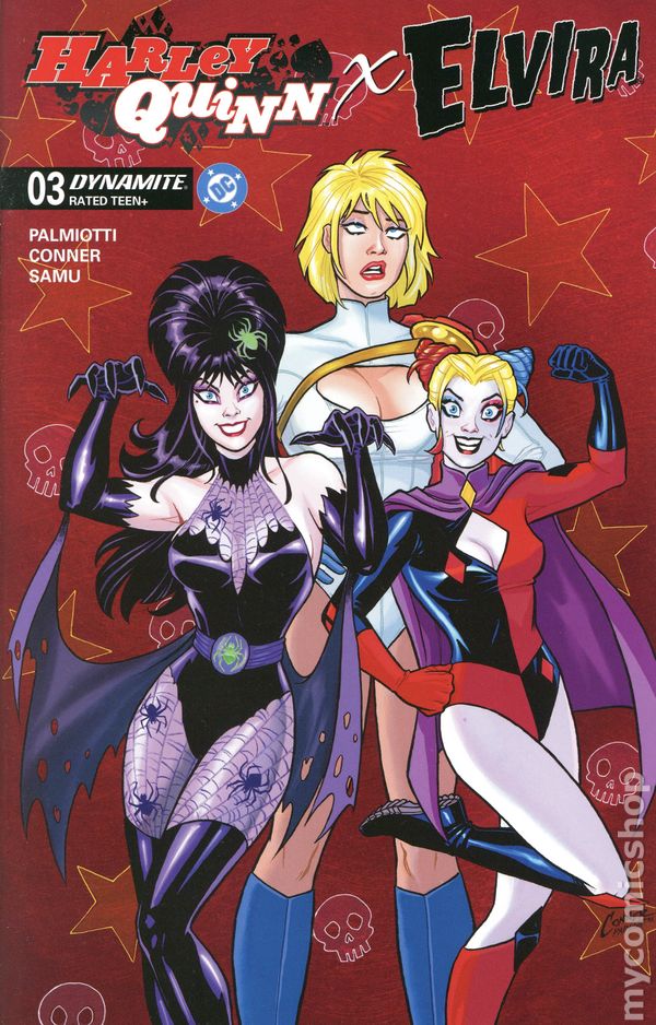 Blind Bag Variant. (W) Amanda Conner, Jimmy Palmiotti (A) Amanda Connor, Juan Samu When Elvira first met Harley Quinn, the Mistress of the Dark was desperate for any plan that could help her save her beloved TV show after it was threatened with cancellation by heartless corporate raiders. Well, the Clown Princess of Crime came up with a plan, all right, and now Elvira is along for the ride no matter how crazy Harley's scheme turns out to be! Putting together the biggest Halloween block party ever staged is a great idea in theory, but pulling it off means raising a massive amount of money and a pile of cash that big is sure to draw the attention of every thug and delinquent in the Tri-State area. If Harley and Elvira want to keep their party funds secure, they're going to have to become too big to fail and that means going international! Cover price $19.81.