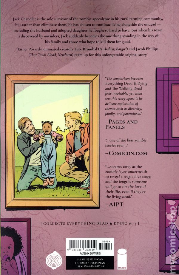 1st printing. Collects Everything Dead and Dying (2025 Image) #1-5. Written by Tate Brombal. Art and Cover by Jacob Phillips. The Last of Us meets Yellowstone in this haunting, rural character piece set during the aftermath of a zombie outbreak. Jack Chandler is the sole survivor of the zombie apocalypse in his rural farming community, but rather than eliminate them, he has chosen to continue living alongside the undead—including the husband and adopted daughter he fought so hard to have. But when his town is discovered by outsiders, Jack suddenly becomes the one thing standing in the way of his family and those who hope to kill them for good. Eisner Award-nominated creators Tate Brombal (Barbalien, Batgirl) and Jacob Phillips (That Texas Blood, Newburn) team up for this unforgettable original story. Softcover, 160 pages, full color. Mature Readers Cover price $16.99.