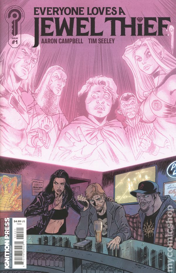 Limited 1 for 10 Retailer Incentive Variant Cover. (W) Tim Seeley; Aaron Campbell (A) Aaron Campbell (CA) Rebekah Isaacs (C) Jordie Bellaire What's a struggling writer to do except...pull off a jewel heist!Novelist C. Scott Frederiksson hasn't written anything of note in years. He's about to lose his adjunct position at the University, be dropped by his agent, and possibly dumped if he doesn't publish a hit and soon.Scott has it all figured out. A masterfully scripted spectacle to dazzle the masses without doing any real harm. A local celebrity will be robbed of her prized possessions, and Scott will come out on the other side as an antihero, showered with publicity and a lucrative new book deal.But he can’t do it alone. Every compelling heist needs a crack team of like-minded crooks, and Scott’s top recruits are his old high school D&D group and their ragtag townie friends coming in clutch with the getaway Geo Storm.It’ll either be the greatest story C. Scott Frederiksson has ever told, or someone’s going to end up dead. Maybe both!Grab a D20 and roll for stealth in this new heist-acular adventure from Tim Seeley and Aaron Campbell because "Everyone Loves a Jewel Thief"! Cover price $4.99.