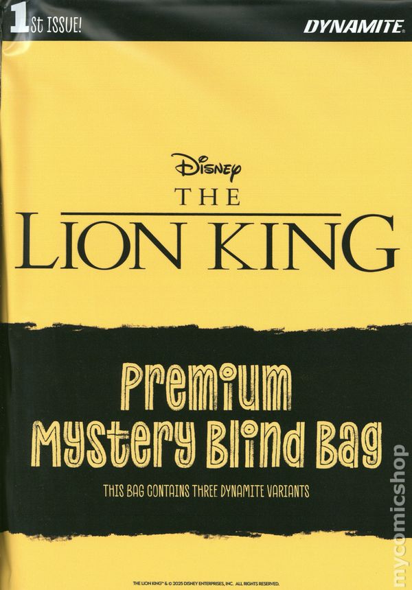 Blind Bag Variant. (W) Edwin Galmon (A) Edwin Galmon THE ONCE AND FUTURE KINGS! Get ready to return to the sweeping plains of Africa for a brand-new series of adventures starring Mufasa and Simba! Written and illustrated by acclaimed talent EDWIN GALMON and set in the golden time before the rise of Scar, The Lion King follows the ruler of the Pride Lands and his young heir as they navigate the complex network of relationships that make up their kingdom — and learn firsthand how to defend it against the forces that threaten it both from the outside and from within. This Blind Bag contains THREE separate limited-edition copies of the exciting first issue that feature unique variant covers drawn at random from a range of art exclusive to this offering. Included in that range are six character variants by Giulia Lomurno and colored blanks - as well as Incentive variants Cover price $19.94.