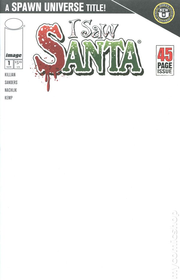 (W) Chris Killian, Andrew Sanders (A) Thomas Nachlik (CA) Blank Sketch Santa gives presents to the good kids and a stocking full of coal to the bad ones. But what happens when one disturbed child takes offense to Santas gift of coal, and makes it his lifes mission to torment Jolly Ol Saint Nick for the rest of his life? Sam and Twitch discover the bodies, but only Spawn can put an end to it. 48 pages, full color, not rated. Cover price $5.99.