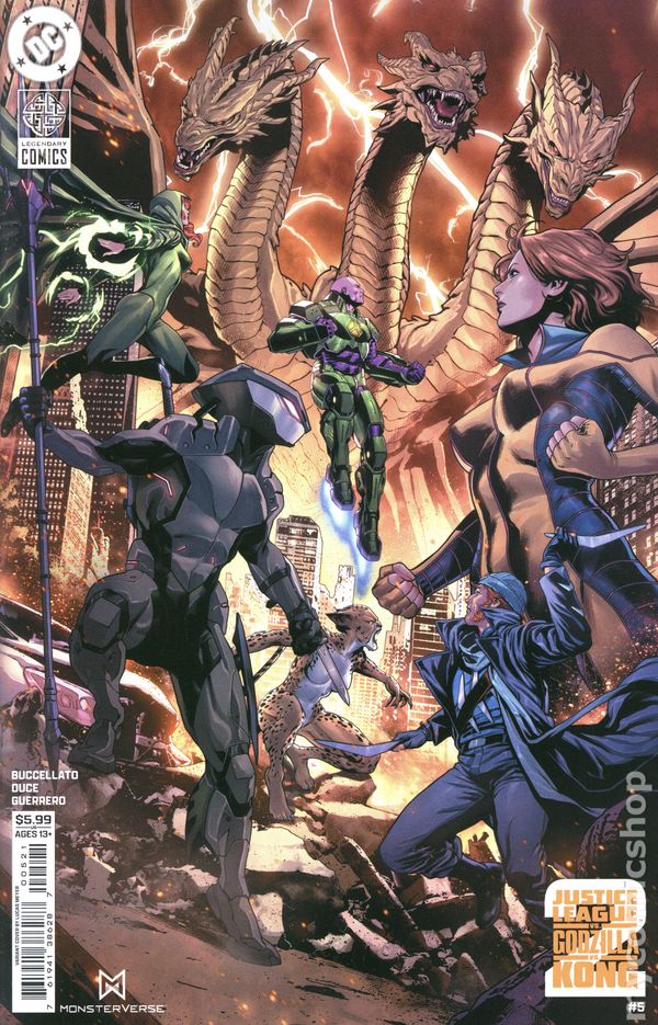 (W) Brian Buccellato (A) Christian Duce (CA) Kevin Maguire ENTER KING GHIDORAH AND RODAN! King Ghidorah and Rodan join the fight as Godzilla settles an old score with Superman. Foes must unite if the Titan threat is to be overcome. As the battle rages on, Lee Shaw nears the completion of his plans to create his own Titan army. 32 pages, full color, rated 13+. Cover price $5.99.