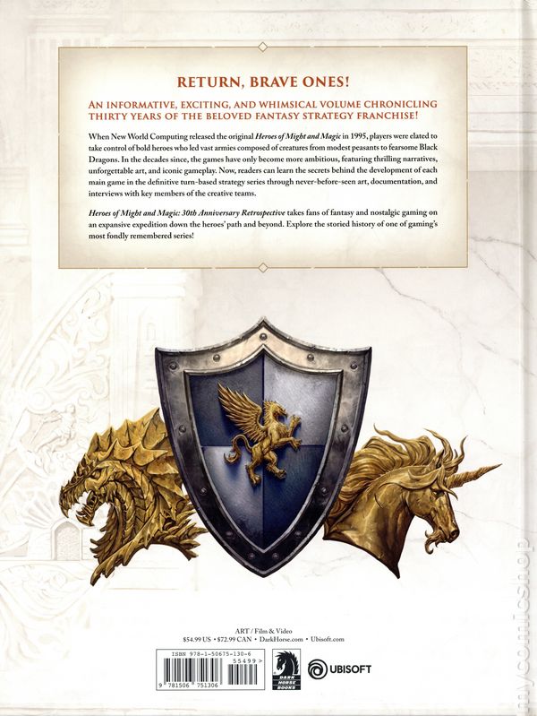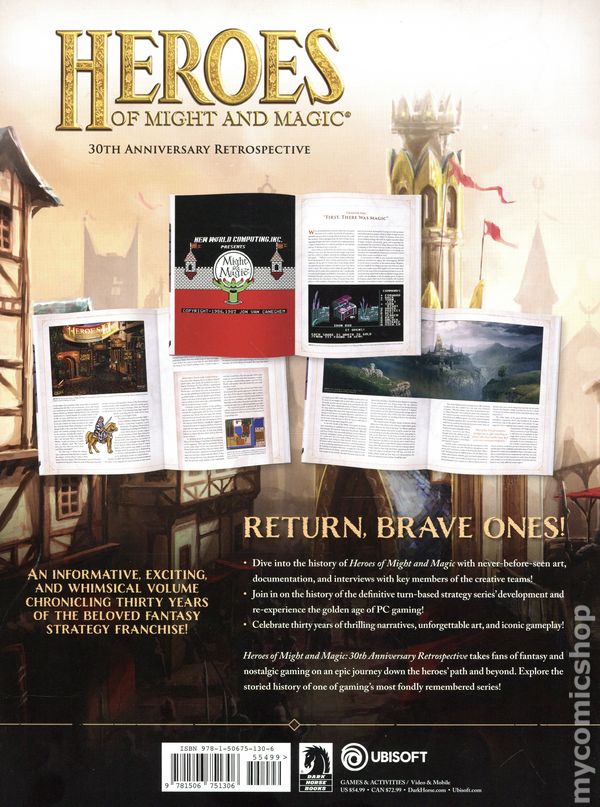 1st printing. By Neal Hallford. Join in on an informative, exciting, and whimsical oversized full-color hardcover volume chronicling thirty years of the beloved fantasy strategy franchise, Heroes of Might and Magic! When New World Computing released the original Heroes of Might and Magic in 1995, players were elated to take control of bold heroes who led vast armies composed of creatures from modest peasants to fearsome Black Dragons. In the decades that followed, the games have only become more ambitious, featuring thrilling narratives, unforgettable art, and iconic gameplay. Now, readers can learn the secrets behind the development of each main game in the definitive turn-based strategy series through never-before seen art, documentation, and interviews with key members of the creative teams. The Heroes of Might and Magic: 30th Anniversary Retrospective takes fans of fantasy, turn-based strategy, and nostalgic gaming on an expansive expedition down the heroes path and beyond. Explore the storied history of one of gamings most fondly remembered series! Hardcover, 9 1/2-in. x 12-in., 192 pages, full color. Rated T Cover price $54.99.