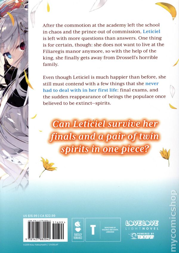 Volume 2 - 1st printing. Written by Kou Yatsuhashi. Art and cover by Mito Nagishiro. Translated by Katie Kimura. After the commotion at the academy left the school in chaos and the prince out of commission, Leticiel is left with more questions than answers. One thing is for certain, though: she does not want to live at the Filiaregis manor anymore, so with the help of the king, she finally gets away from Drossell's horrible family. Even though Leticiel is much happier than before, she still must contend with a few things that she never had to deal with in her first life: final exams, and the sudden reappearance of beings the populace once believed to be extinct—spirits. Can Leticiel survive her finals and a pair of twin spirits in one piece? Softcover, 5-in. x 7-in., 254 pages, Text (with B&W Chapter Illustrations). Cover price $16.99.