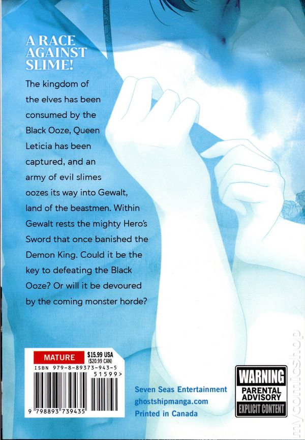 Volume 6 - 1st printing. Written by Umetane. Art and cover by Abi. Character Design by Fufukuro. Translated by Miki Z. Fiana and Arfila, A RACE AGAINST SLIME! The kingdom of the elves has been consumed by the Black Ooze, Queen Leticia has been captured, and an army of evil slimes oozes its way into Gewalt, land of the beastmen. Within Gewalt rests the mighty Heros Sword that once banished the Demon King. Could it be the key to defeating the Black Ooze? Or will it be devoured by the coming monster horde? Softcover, 5-in. x 7-in., 168 pages, B&W. Mature Readers Cover price $15.99.