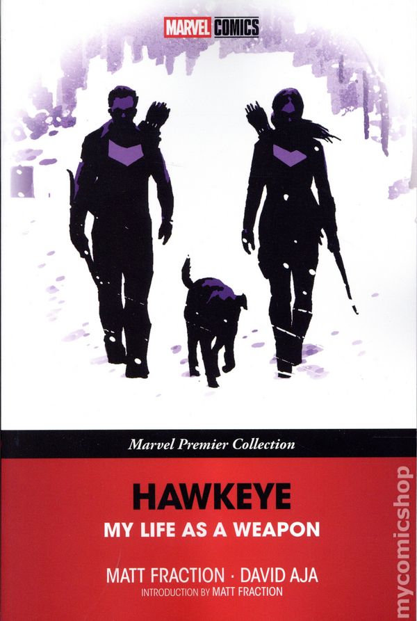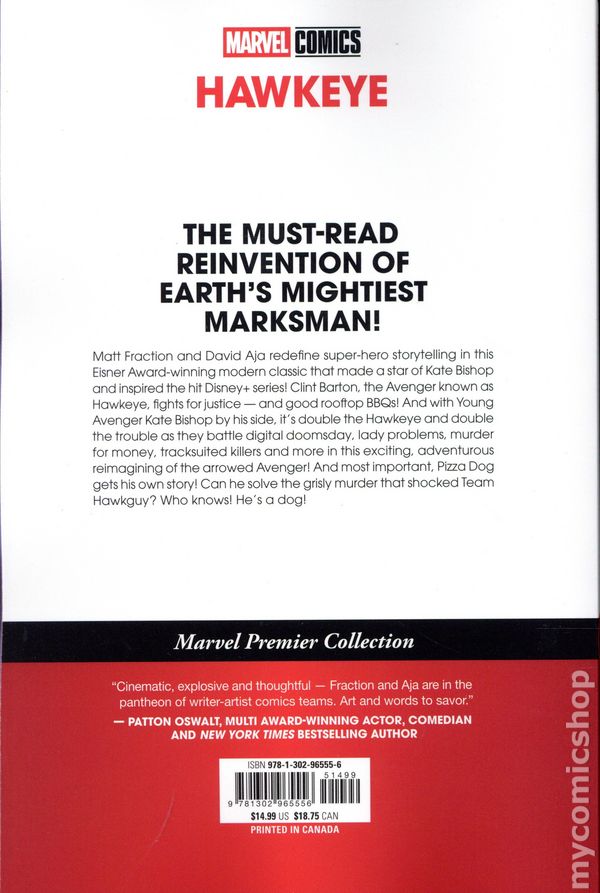 1st printing. Collects Hawkeye (2012 4th Series) #1-11 and Young Avengers Presents (2008) #6. Written by Matt Fraction. Art by David Aja, Javier Pulido, Francesco Francavilla, and Alan Davis. Cover by David Aja. Introduction by Matt Fraction. The Eisner Award-winning modern classic, presented in a newly designed book format edition with a brand-new introduction by author Matt Fraction. Matt Fraction (Batman, Invincible Iron Man) and David Aja (The Immortal Iron Fist, The Seeds) deliver a stylish, cinematic, and profoundly human take on Marvels most unlikely Avenger — one that inspired countless creators, won armfuls of awards, and laid the groundwork for the hit Disney+ series. Clint Barton, ordinary guy in a world of gods and super-soldiers, just wants to do right — and maybe grill a decent rooftop BBQ. Alongside Kate Bishop, his equally sharp-eyed protégé, he takes aim at digital digital doomsday, Russian mobsters in tracksuits, and the everyday chaos of life in New York. With Ajas minimalist brilliance and Fractions razor-sharp voice, these stories turned the small details — neighbors, stray dogs, broken tape decks — into unforgettable legend. And then theres Pizza Dog. Yes, he gets his own Eisner-winning story. Bonus Content: variant covers, sketchbook, cover concepts, page process, color guides, David Ajas drawing playlists. Softcover, 5 1/2-in. x 8-in., 280 pages, full color. Teen+ Cover price $14.99.