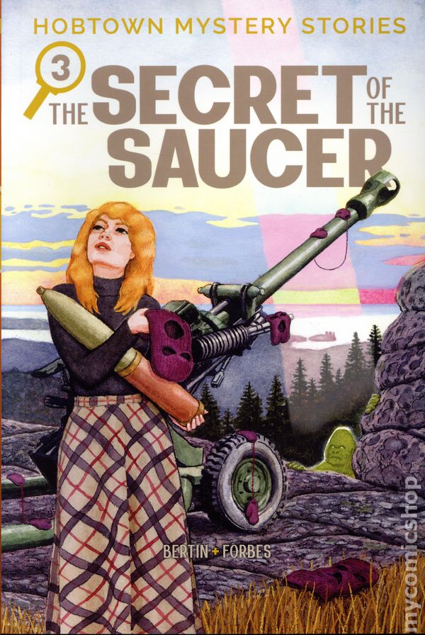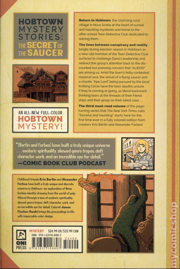 Full Color Edition - Volume 3 - 1st printing. "The Secret of the Saucer!" Written by Kris Bertin. Art and cover by Alexander Forbes. Return to Hobtown, the charming rural village in Nova Scotia at the heart of surreal and haunting mysteries, and home to the after-school Teen Detective Club dedicated to solving them. The third must-read volume of the page-turning series that The New York Times calls "forceful and haunting" starts here for the first time ever in a fully colored edition from creators Kris Bertin and Alexander Forbes! The lines between conspiracy and reality tangle during election season in Hobtown as a new-old member of the Teen Detective Club surfaces to challenge Dana's leadership and redirect the group's attention back to the discounted but pressing concern that "ALIENS!" are among us. On a grander scale, amid the town's hotly contested mayoral race, the arrival of a flying saucer and a chaotic "Ape Lord" being pursued by the local Knitting Circle have the teen sleuths of Hobtown unsure if they're coming or going, as literal backward thinking tears at the threads of their friendships and their grasp on their latest case . . . Softcover, 6-in. x 9-in., 208 pages, full color. Cover price $24.99.