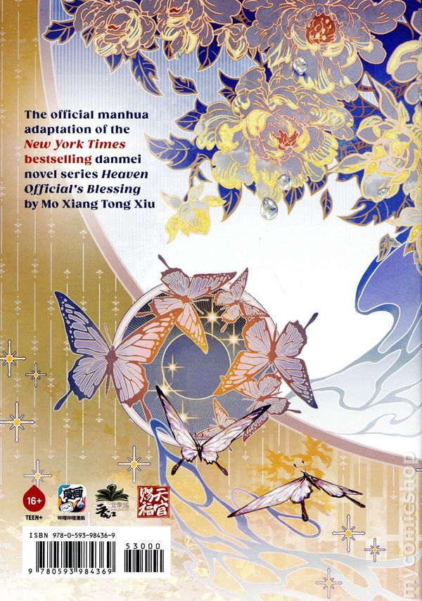Volume 1 - 1st printing. Written by Mo Xiang Tong Xiu. Art and cover by STARember. A fallen god unravels supernatural mysteries and comes face-to-face with ghosts from his past in this manhua (comic) adaptation of the New York Times bestselling danmei novel by Mo Xiang Tong Xiu. Featuring stunning art by STARember, the official manhua produced by BILIBILI COMICS is now available in English in print for the first time. Xie Lian, once the darling of the heavens, is a twice-banished god infamous for his fall from grace. Eight hundred years have passed since his mortal life as the Crown Prince of Xianle, and hes now the laughingstock of the three realms. So when he ascends to godhood for a third time, it causes an uproar among his divine peers. Ascension may be nothing new to Xie Lian, but this time he has no followers, little power, and less luck. To repay his heavenly debts, Xie Lian must descend to the Mortal Realm to hunt ghosts that prey upon the living. There, he encounters a mysterious stranger—but is this newcomer friend or foe . . . or something else entirely? Volume 1 includes the prologue and episodes 1–14 of the original webcomic based on the webnovel Tian Guan Ci Fu published on JJWXC. Hardcover, 256 pages, full color. Age 16 and up Cover price $30.00.