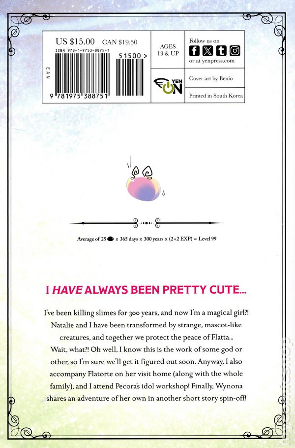 Volume 17 - 1st printing. Written by Kisetsu Morita. Art and cover by Benio. Translated by Jasmine Bernhardt. I've been killing slimes for 300 years, and now I'm a magical girl?! Natalie and I have been turned into strange, mascot-like creatures, and together we protect the peace of Flatta... Wait, what?! Oh well, I know this is the work of some god or other, so I'm sure we'll soon have it sorted. Then, I accompany Flatorte on her visit home (along with the whole family) and attend Pecora's idol workshop! Finally, Wynona shares an adventure of her own. Softcover, 5-in. x 8-in., 224 pages, Text (with B&W Chapter Illustrations). For readers ages 13 years and up Cover price $15.00.