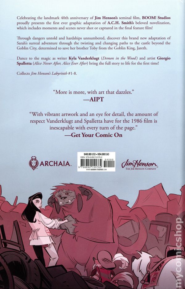 1st printing. Collects Labyrinth (2024 Boom) Jim Henson's #1-8. Based on the Novel by A.C.H. Smith. Adapted by Kyla Vanderklugt. Art by Giorgio Spalletta and Cyril Glerum. Cover by Nimit Malavia. Back Cover by Giorgio Spalletta. Celebrating the landmark 40th anniversary of Jim Henson's seminal film, BOOM! Studios proudly presents the first ever graphic adaptation of A.C.H. Smith's beloved novelization, which includes moments and scenes never shot or captured in the final feature film! Through dangers untold and hardships unnumbered, discover this brand new adaptation of her surreal adventure through the twisting and changing paths to the castle beyond the Goblin City, determined to save her brother Toby from the Goblin King, Jareth. Dance to the magic as writer Kyla Vanderklugt (Demon in the Wood) and artist Giorgio Spalletta (Alice Never After, Alice Ever After) bring the full story to life for the first time! Hardcover, 7 1/2-in. x 11 1/2-in., 224 pages, full color. Rated T Cover price $40.00.