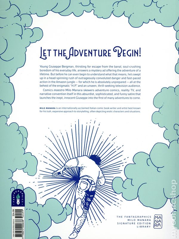 1st printing. Story and art by Milo Manara. Young Giuseppe Bergman, thirsting for escape from the banal, soul-crushing boredom of his everyday life, answers a mysterious ad offering the adventure of a lifetime. But before he even gets a chance to understand what that means, hes swept up in a headlong rush of outrageously convoluted danger and fast-paced action — for which he is absolutely unprepared — all at the behest of the enigmatic H.P. and an unseen television audience. Artist/writer/creator Milo Manara skewers adventure comics, reality TV, and narrative convention itself in this absurdist, sophisticated satire that launches the innocent Giuseppe into the first of many adventures to come. The Magnificent Adventure, complete in one volume. Softcover, 9-in. x 12-in., 112 pages, B&W. Mature Readers Cover price $24.99.