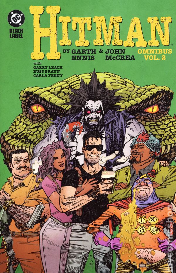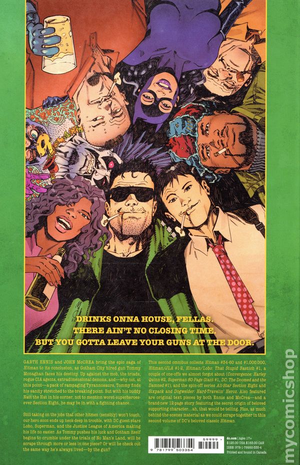 Volume 2 - 1st printing. Collects Hitman (1996-2001) #34-60, Hitman One Million (1998), JLA/Hitman (2007) #1-2, Hitman/Lobo: That Stupid Bastich! (2000), All Star Section 8 (2015 DC) #1-6, and Six Pack and Dog Welder: Hard Travelin' Heroez (2016) #1-6, and stories from Convergence: Harley Quinn (2015 DC) #2, Superman 80-Page Giant (1999) #1, and DC: The Doomed and the Damned (2020 DC). Written by Garth Ennis. Art by John McCrea, Garry Leach, Doug Mahnke, Russell Braun, Nelson Dicastro, and PJ Holden. Cover by John McCrea. FEATURING AN EXCLUSIVE NEW STORY FOR THIS EDITION! Garth Ennis and John McCrea bring the epic saga of Hitman to its conclusion, as Gotham City hired gun Tommy Monaghan faces his destiny. Up against the mob, the triads, rogue CIA agents, extradimensional demons, and--why not, at this point--a pack of rampaging tyrannosaurs, Tommy finds his sanity stretched to its breaking point. But with his buddy Natt the Hat in his corner, not to mention worst-superheroes-ever Section Eight, he may be in with a fighting chance... The volume also features original text pieces by both Ennis and McCrea--and a brand-new 12-page story featuring the secret origin of beloved supporting character...ah, that would be telling. Hardcover, 8 1/2-in.x 11-in., 1144 pages, full color. Mature Readers Cover price $125.00.