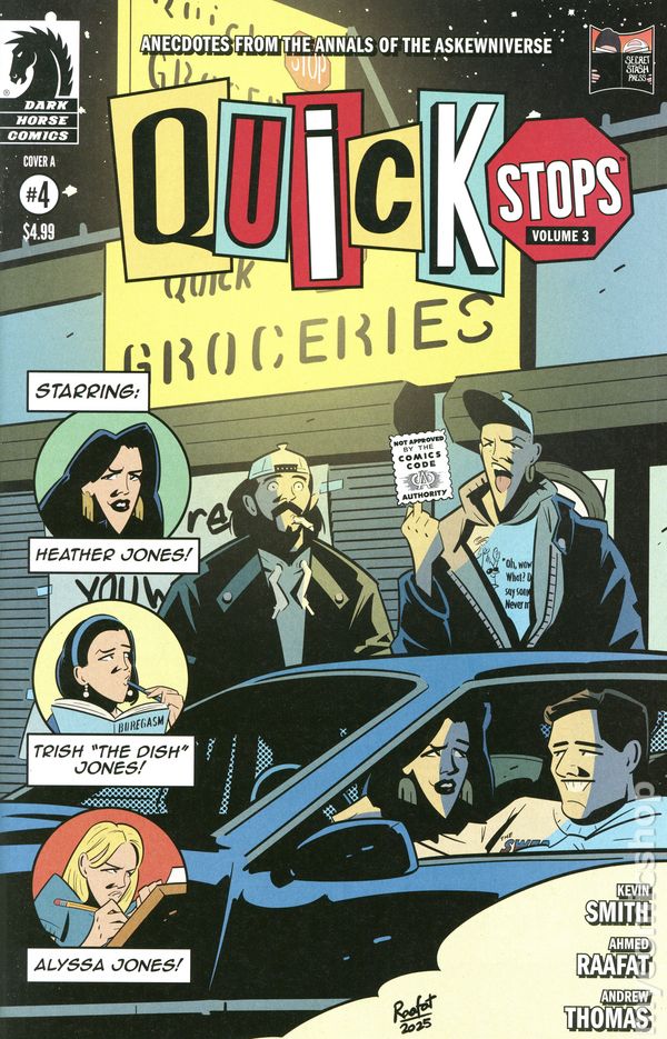 (W) Kevin Smith (A) Ahmed Raafat (CA) Ahmed Raafat The enigmatic Jones sisters have appeared peripherally throughout the View Askewniverse, adding a little free-spirited spice to the day-to-day of Leonardo, New Jersey. In the final issue of Quick Stops Volume 3, we find all three sisters together for an illuminating family-focused story time. This comic takes place the day after Tricia Jones witnessed a unique live recording of a game show at her local mall in Mallrats, the day Heather Jones and Rick Derris left Quick Stops Groceries for some beach time in Clerks, and while Chasing Amys Alyssa Jones trains down from the city to visit her parents.After their tryst at the beach, Heather and Rick head to the Jones family home. There, they catch up with Heathers sisters Tricia and Alyssa. It turns out Rick and his buddy Cohee Lundin used to spend a lot of time in the Jones household and have an…intimate connection to infamous Finger Cuffs story. It turns out that there is more to that fateful rendezvous than the malicious rumor mill would have you believe—enough complicated human sexuality that an academic-minded Tricia might even include it in her book!• Series finale! 32 pages, full color, not rated. Cover price $4.99.