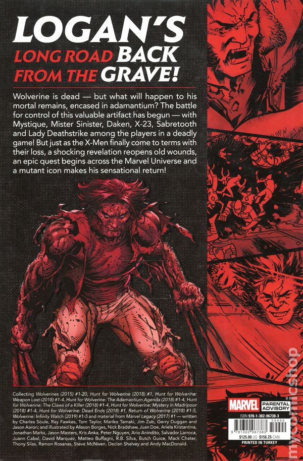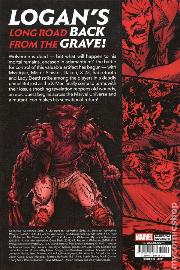 1st printing. Collects Wolverines (2014 Marvel) #1-20, Hunt for Wolverine (2018), Hunt for Wolverine: Weapon Lost (2018) #1-4, Hunt for Wolverine: The Adamantium Agenda (2018) #1-4, Hunt for Wolverine: The Claws of a Killer (2018) #1-4, Hunt for Wolverine: Mystery in Madripoor (2018) #1-4, Hunt for Wolverine: Dead Ends (2018), Return of Wolverine (2018 Marvel) #1-5, Wolverine: Infinity Watch (2019 Marvel) #1-5; and material from Marvel Legacy (2017). Written by Charles Soule, Ray Fawkes, Tom Taylor, Mariko Tamaki, Jim Zub, and Gerry Duggan. Art by Nick Bradshaw, Walden Wong, Alisson Borges, Juan Doe, Ariela Kristantina, Jonathan Marks, Jason Masters, Kris Anka, Peter Nguyen, Derek Fridolfs, Ario Anindito, Salvador Larroca, Juann Cabal, Matteo Buffagni, R. B. Silva, Andriano Di Benedetto, Butch Guice, Mark Chater, Cam Smith, Thony Silas, Ramon Rosanas, Steve McNiven, Declan Shalvey, Jay Leisten, and Andy MacDonald. Cover by R. B. Silva. "The devastating aftermath of Wolverine's death - and his remarkable return from the grave! Logan is dead - but what will happen to his mortal remains, encased in Adamantium? The battle for control of this valuable artifact has begun - with Mystique, Mister Sinister, Daken, X-23, Sabretooth and Lady Deathstrike among the players in this deadly game! But just as the X-Men finally come to terms with Wolverine's death, a shocking revelation reopens old wounds - and an epic quest begins across the Marvel Universe. But who will solve the puzzle first? Will it be Daredevil, Misty Knight and their crack squad of investigators? Or Logan's fellow New Avengers: Iron Man, Spider-Man, Jessica Jones and Luke Cage? The upshot is that Logan is alive! But how? Why? And how has this chilling experience changed him? Wolverine awakens in a destroyed lab, his memories fragmented, his claws burning hot and his identity in doubt. Can he handle the truth of what he's done? Now that Logan has risen, how far can he fall? And does he have...an Infinity Stone?! Hardcover, 8 1/2-in. x 11-in., 1,232 pages, full color. Rated T+ Cover price $125.00.