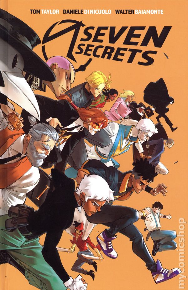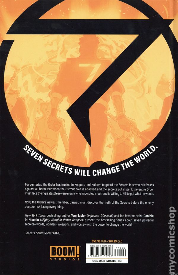 1st printing. Collects Seven Secrets (2020 Boom) #1-18. Written by Tom Taylor. Art and cover by Daniele Di Nicuolo. NYT bestselling author Tom Taylor and fan favorite artist Daniele Di Nicuolo chart an epic saga chronicling seven powerful secrets—words, wonders, weapons, and worse—with the power to change the world, collected in one deluxe volume for the very first time. SEVEN SECRETS WILL CHANGE THE WORLD. For centuries, the Order has trusted in Keepers and Holders to guard the Secrets in seven briefcases against all harm but when their stronghold is attacked and the secrets put in peril, the entire Order must face their greatest fear—an enemy who knows too much and is willing to kill to get what he wants. Now, the Order's newest member, Caspar, must discover the truth of the Secrets before the enemy does, or risk losing everything. New York Times bestselling author Tom Taylor (DCeased) and fan favorite artist Daniele Di Nicuolo (Mighty Morphin Power Rangers) present a sweeping saga about seven powerful secrets—words, wonders, weapons, and worse—with the power to change the world. The entire journey is available now as a deluxe hardcover edition, bringing every issue of the critically acclaimed, action-packed series together for the very first time. Hardcover, 7 1/2-in. x 11-in., 496 pages, full color. Rated T Cover price $59.99.