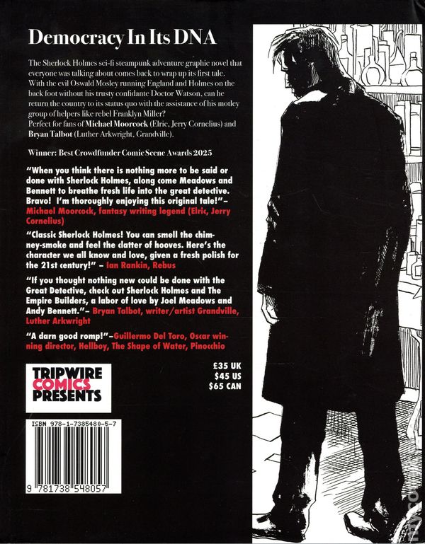 Volume 2 - 1st printing. Written by Joel Meadows. Art by Andy Bennett. Cover by Dan Panosian. The Sherlock Holmes sci fi steampunk adventure graphic novel returns to wrap up its first tale. With the evil Oswald Mosley running England and Holmes on the back foot without his trusty confidante Doctor Watson, can he return the country to its status quo with the assistance of his motley group of helpers like rebel Franklyn Miller? Features an 8-page color section with pin-ups from George Pratt, John K. Snyder III, Barry Kitson, and Tomm Coker, this concludes the first epic story of Sherlock Holmes and The Empire Builders. Hardcover, 120 pages, B&W. Teen Cover price $55.00.