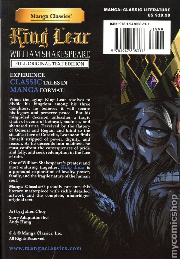 1st printing. Based on the Story by William Shakespeare. Adapted by Crystal Chan. Art and cover by Julien Choy. I love your Majesty according to my bond; no more nor less. The aging King Lear of Britain has decided to abdicate his throne and divide his realm among his three beloved daughters. The largest share shall go to the one who loves him best - unfortunately, Lear mistakes empty, overblown flattery for true devotion. His error plunges the realm into war and drives Lear to rain-drenched madness. Manga Classics is proud to bring you an unabridged manga adaptation of Shakespeare's beloved tragedy, considered to be one of the greatest works of literature ever written! Softcover, 5 3/4-in.x 8 1/4-in., 340 pages, B&W. Cover price $19.99.