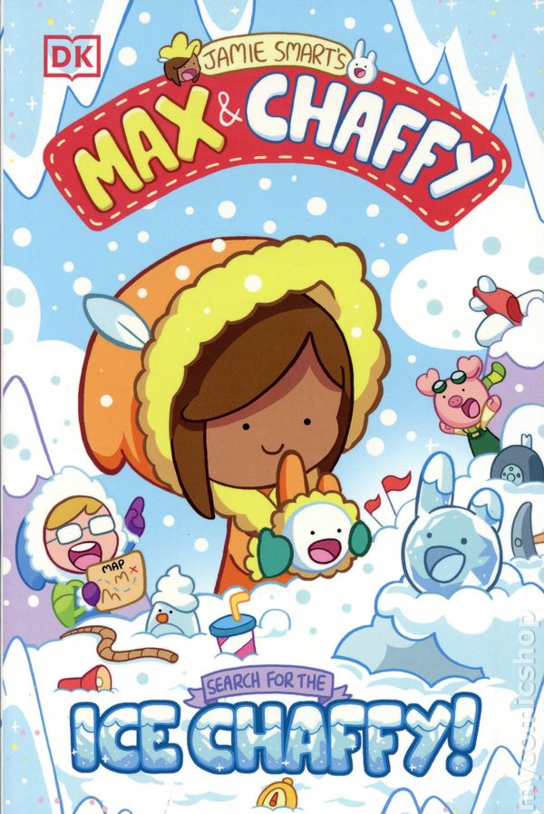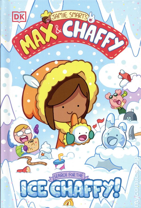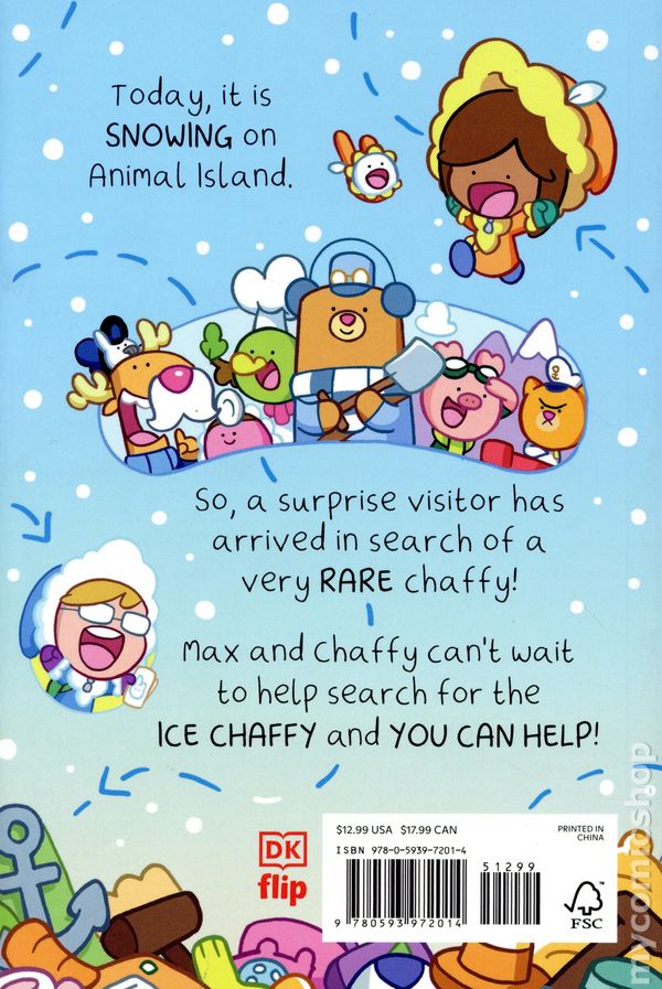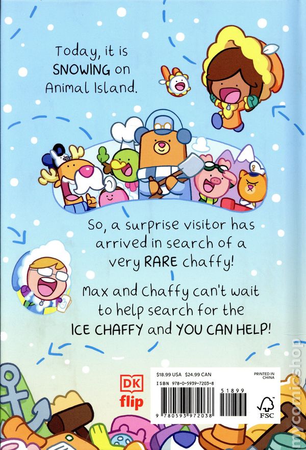 1st printing. Story and art by Jamie Smart. It's a new day on Animal Island, but something is different… It's snowing! New friend Jacob has arrived to search the snowy landscape for the elusive Ice Chaffy. Who better to help him than Max and Chaffy? Skip through snowy meadows, explore ice caves, and follow the clues to try and find the sparkly Ice Chaffy before the snow melts. From bestselling author Jamie Smart comes another vibrant, highly visual graphic novel about discovering new things, making friends, and returning what's been lost to its rightful owner. This graphic novel for kids features: Content written by bestselling author of Bunny vs. Monkey, Jamie Smart, who has exceeded 1 million lifetime sales. The perfect introduction to independent reading, with warm, lovable characters and an adventure centered around friendship and fun. Search and find pages included in addition to the story to keep kids engaged and interacting. Each hilarious Max and Chaffy story is interspersed with engaging search and find pages, since Chaffy has a habit of getting lost, as well as items that aren't where they should be! Discover how Max first met Chaffy in Max and Chaffy: Welcome to Animal Island, or help search for Crumbles' special strawberry cupcake in Max and Chaffy: The Great Cupcake Mystery. Softcover, 5 1/2-in. x 8 1/2-in., 128 pages, full color. All Ages Cover price $12.99.