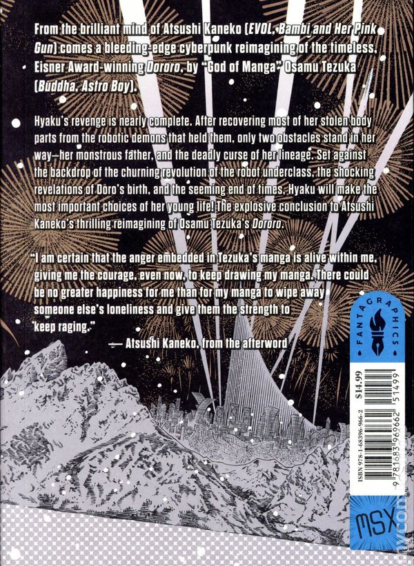 Volume 3 - 1st printing. Based on DORORO by Osamu Tezuka. Adapted by Atsushi Kaneko. Translated by Ben Applegate. The broken and discarded creatures of the city have had enough of the caste system that keeps them servile, and they rise up to strike… Doro the little thief must confront their past and make impossible decisions about their future... And Hyaku? Hyakus quest to retrieve the stolen pieces of her body is nearly at an end, and her path of righteous and bloody vengeance leads directly to the great betrayer, her father. Robots, humans, creatures, monsters: no one will survive unscathed.Final conflicts rage in this spectacular conclusion to Atsushi Kanekos epic cyberpunk masterpiece! Featuring stunning and visceral artwork and a story that is startlingly relevant to today's audiences, deeply intertwined with the work of Osamu Tezuka's classic samurai manga masterpiece, Dororo. Softcover, 5-in. x 7-in., 228 pages, B&W. Cover price $14.99.