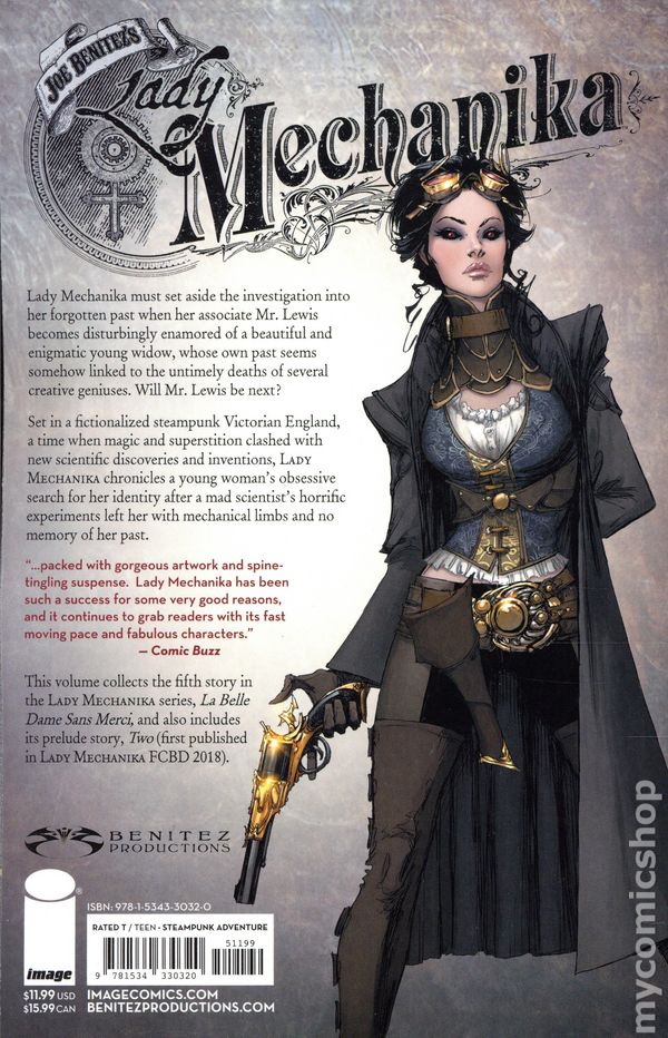 2nd Edition - Volume 5 - 1st printing. "La Belle Dame Sans Merci!" Collects Lady Mechanika: La Belle Dame Sans Merci (2018 Benitez) #1-3 and Lady Mechanika (2016 Benitez Productions) FCBD #2018. Written by Joe Benitez and M. M. Chen. Art by Joe Benitez, Martin Montiel, and Beth Sotelo. Cover by Joe Benitez. Lady Mechanika's investigation into her forgotten past is overshadowed by concern for her associate Mr. Lewis when he becomes enamored of a beautiful and enigmatic young widow, whose own past seems disturbingly linked to the untimely deaths of several creative geniuses. Will Mr. Lewis be next? Softcover, 104 pages, full color. Teen Cover price $11.99.