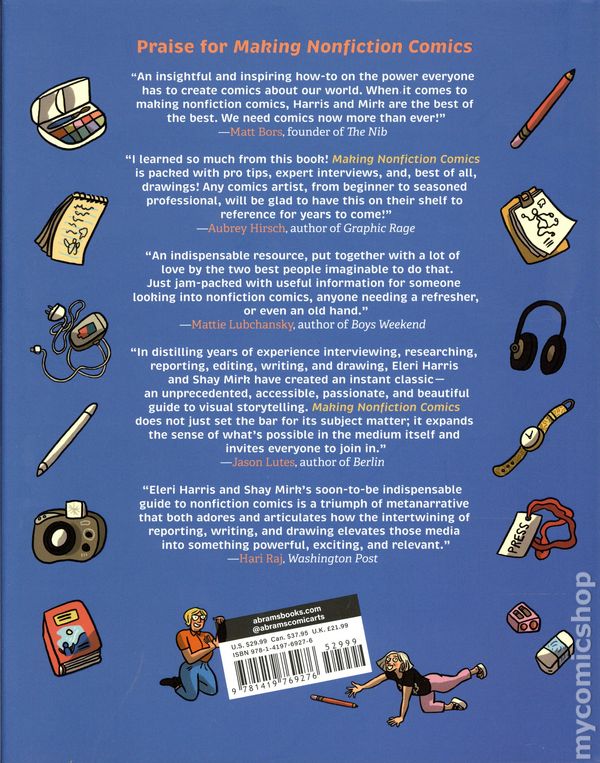 1st printing. Written by Shay Sarah Mirk and Eleri Harris. Art by Derf Backderf, Box Brown, Thi Bui, Nicole Georges, Malaka Gharib, Nate Powell, Kristen Radtke, and Victoria Ying. The definitive guide to writing, drawing, and publishing nonfiction comics from award-winning creators Shay Mirk and Eleri Harris MAKING NONFICTION COMICS is an accessible guide to nonfiction comics perfect for graphic novel readers, writers, and of course, aspiring comics artists. This new classic is a must-have for readers of Scott McClouds UNDERSTANDING COMICS and Lynda Barrys MAKING COMICS. Sarah Shay Mirk and Eleri Mai Harris, award-winning graphic journalists and longtime editors of the critically acclaimed graphic journalism site the Nib, have compiled the perfect field guide to graphic journalism while showcasing valuable skills and practices for creating nonfiction comics. Mixing comics, prose, infographics, illustrations, and interviews with some of the worlds most influential nonfiction comics creators, Harris and Mirk introduce readers to nonfiction visual stories while also articulating the standards and ethics around blending traditional journalism with the visual language of comics. Featuring contributions from Derf Backderf, Box Brown, Thi Bui, Nicole Georges, Malaka Gharib, Nate Powell, Kristen Radtke, Victoria Ying, and more. Hardcover, 7 1/2-in. x 9 1/2-in., 272 pages, full color. Cover price $29.99.