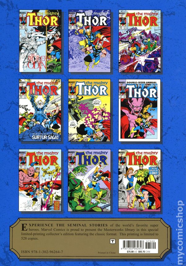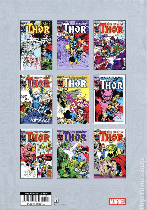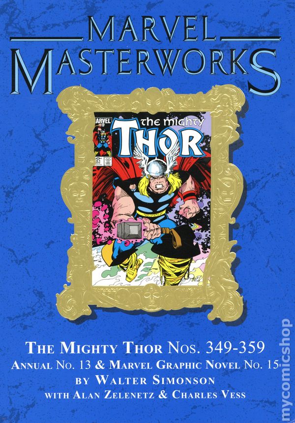 Volume 388 - 1st printing. "The Mighty Thor: Book 24!" Collects Thor (1962-1996 Marvel 1st Series Journey Into Mystery) #349-359, Thor (1962-1996 Marvel 1st Series Journey Into Mystery) Annual #13, and The Raven Banner: A Tale of Asgard GN (1985 Marvel Graphic Novel). Written by Walt Simonson, Alan Zelenetz, and Bob Harris. Art by Walt Simonson, Sal Buscema, John Buscema, Butch Guice, Bob Layton, and Charles Vess. Cover by Walt Simonson. Introduction by Walt Simonson. Legendary writer/artist Walter Simonson continues his character-redefining THOR run, still considered by many to be one of the greatest in comic book history! Surtur is free! The Casket of Ancient Winters has been opened! An army is marching on Asgard and Earth! Walter Simonson has set the stage for the truly epic conclusion of his "Surtur Saga" and does it ever deliver! Thor, Beta Ray Bill and a host of Marvel Universe heroes fight back the endless invading hordes while Odin marshals his strength to battle Surtur. In the aftermath of this great war, the Rainbow Bridge is shattered and Odin has fallen, which leaves an opening for lying Loki and lascivious Lorelei to work their take advantage and take over. Also featuring a never before reprinted Annual penciled and inked by John Buscema and the "Raven Banner" graphic novel lavishly illustrated by Charles Vess! Hardcover, 392 pages, full color. Rated T Cover price $75.00.