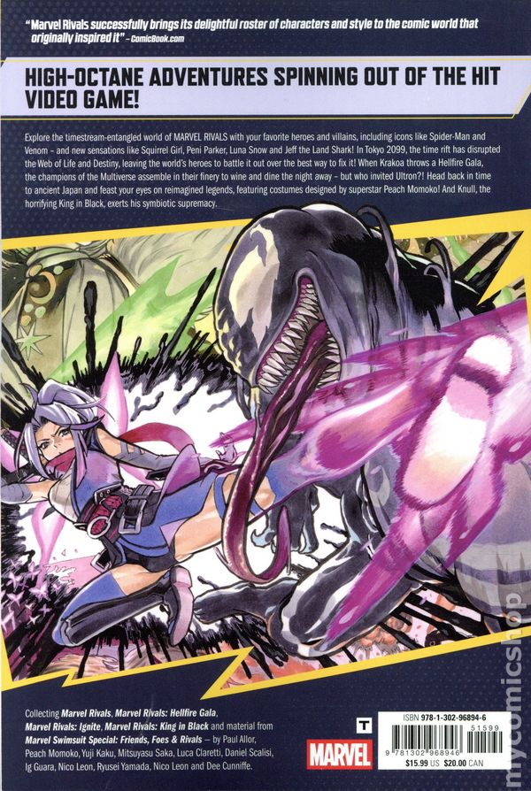 1st printing. Collects Marvel Rivals (2025 Marvel), Marvel Rivals: Hellfire Gala (2025 Marvel), Marvel Rivals: King in Black (2025 Marvel), Marvel Rivals: Ignite (2025 Marvel), Marvel Swimsuit Special: Friends, Foes and Rivals (2025 Marvel). Written by Paul Allor, Peach Momoko, Tim Seeley, and Tony Fleecs. Art by Luca Claretti, Daniel Scalisi, Ig Guara, Nico Leon, Yuji Kaku, Nick Bradshaw, Joshua Cassara, Marguerite Sauvage, Mahmud Asrar, Aaron Kuder, John Tyler Christopher, Ron Lim, Nic Klein, David Marquez, Olivier Coipel, Mirka Andolfo, Rian Gonzales, Ryusei Yamada, Luciano Vecchio, and Adam Hughes. Cover by Tokitokoro. The smash-hit game played by millions across the globe now expands onto the comic page! Step inside the timestream-shattered world of MARVEL RIVALS, where icons like Spider-Man and Venom clash with breakout sensations such as Squirrel Girl, Peni Parker, Luna Snow, and the ever-unexpected Jeff the Land Shark. In Tokyo 2099, the fractured Web of Life and Destiny throws reality into chaos. On Krakoa, the Hellfire Gala brings Multiversal champions together—until Ultron crashes the party. Travel back to ancient Japan, where superstar artist Peach Momoko unveils breathtaking reimaginings of Marvel legends. And looming over it all is Knull, the King in Black, exerting his symbiotic supremacy across time and space. Softcover, 152 pages, full color. Rated T Cover price $15.99.