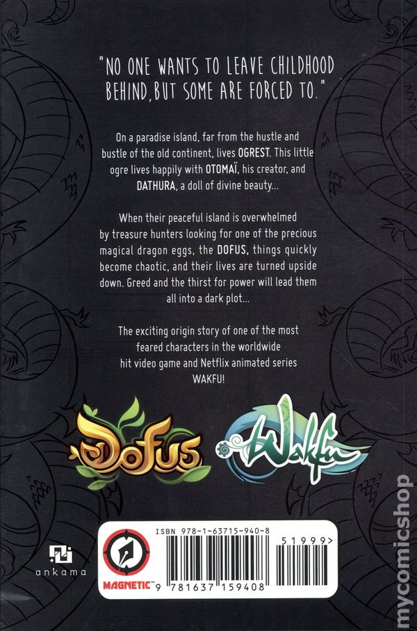 Volume 1 - 1st printing. Story and art by Mig. Set within the video-game universe of Wakfu, the popular online role-playing game and animated series on Netflix!On a paradise island far from the hustle and bustle of the old continent lives Ogrest, a tiny ogre who lives happily with Otomaï, his creator, and Dathura, a doll of divine beauty. When the Dofus—precious magical dragon eggs—disappear, all budding adventurers are rousted in search of the treasure. But Ogrests island is home to a Dofus that quickly draws greed and thirst for power that leads them all into a dark plot . . . Softcover, 6-in. x 9-in., 192 pages, full color. Teen+ Cover price $19.99.