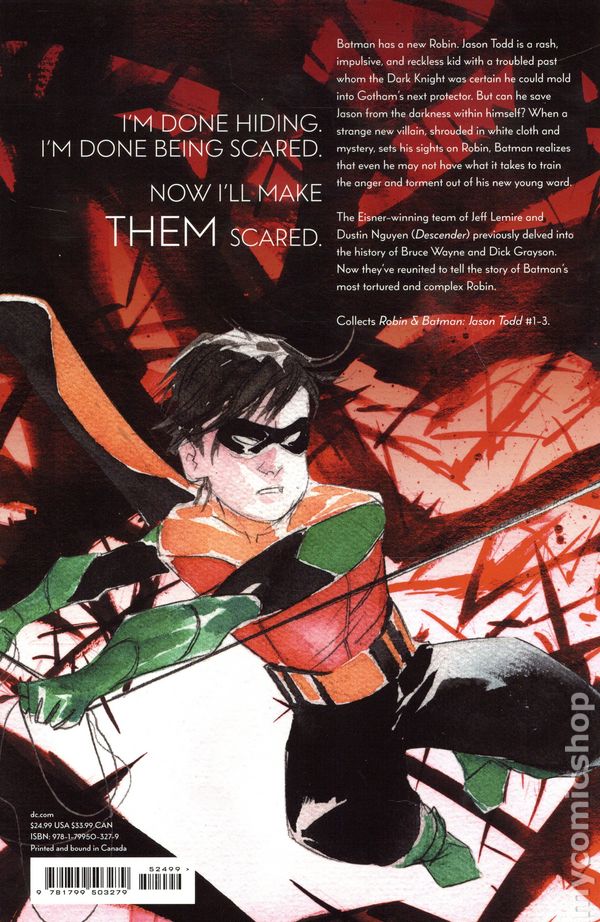 1st printing. Collects Robin and Batman: Jason Todd (2025 DC) #1-3. Written by Jeff Lemire. Art and cover by Dustin Nguyen. EISNER WINNERS JEFF LEMIRE AND DUSTIN NGUYEN DIG DEEP INTO BATMAN AND ROBIN'S HISTORY! Batman has a new Robin. Jason Todd is a rash, impulsive, and reckless kid with a troubled past who the Dark Knight was certain he could mold into Gotham's next protector. But can he save Jason from the darkness within himself? When a strange new villain, shrouded in white cloth and mystery, sets his sights on Robin, Batman realizes that even he may not have what it takes to train the anger and torment out of his new young ward. The Eisner-winning team of Jeff Lemire and Dustin Nguyen (Descender) delved into the history of Bruce Wayne and Dick Grayson in 2022. Now, they've reunited to tell the story of Batman's most tortured and complex Robin. Hardcover, 144 pages, full color. Teen Cover price $24.99.