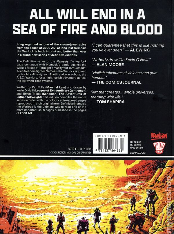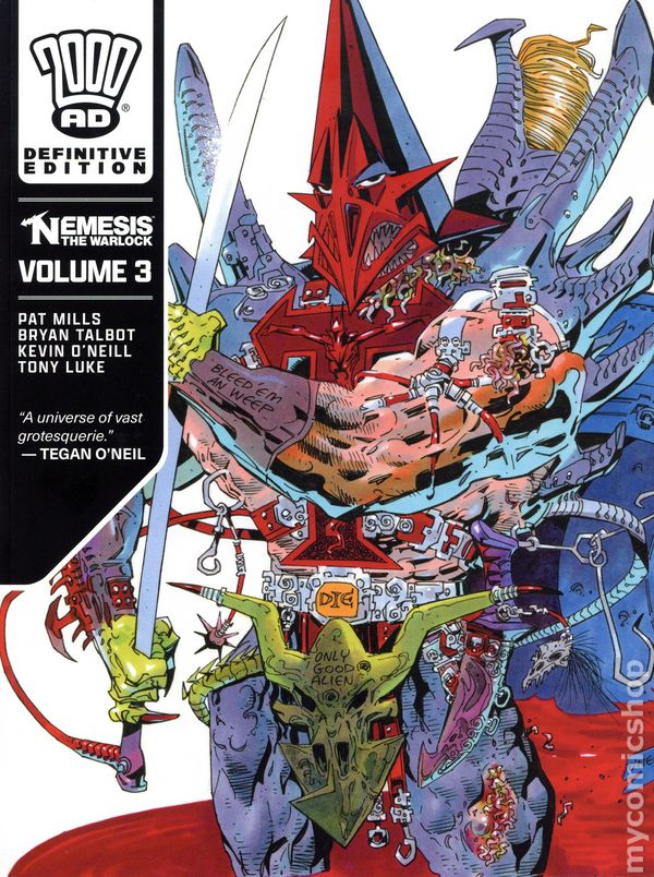 Volume 3 - 1st printing. Written by Pat Mills and Tony Luke. Art by Kevin O'Neill, Bryan Talbot, Tony Luke. Cover by Kevin O'Neill. The Definitive series of the Nemesis the Warlock saga continues with Nemesis's continuing battle against the wicked forces of Termight's mad tyrant Torquemada, alien freedom fighter Nemesis The Warlock is joined by his bloodthirsty son Thoth and war robots, the A.B.C. Warriors, for a nightmarish adventure across the terrifying Time Wastes. Written by Pat Mills (Marshal Law) and drawn by Kevin O'Neill (League of Extraordinary Gentlemen) and Bryan Talbot (Sandman, The Adventures of Luther Arkwright), this edition compiles the entire series in order, with the colour centre-spread pages reproduced in their original form. Definitive Nemesis the Warlock is the ultimate way to read one of the most important sci-fi sagas published in the pages of 2000 AD. Softcover, 9-in. x 12-in., 224 pages, PC/PB&W. Teen Cover price $32.99.