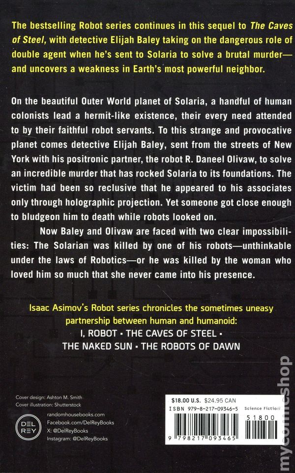 1st printing. By Isaac Asimov. Cover by Shutterstock. The bestselling Robot series continues in this sequel to The Caves of Steel, with detective Elijah Baley taking on the dangerous role of double agent when hes sent to Solaria to solve a brutal murder—and uncover a weakness in Earths most powerful neighbor. With his fertile imagination, his wit, and his prolific output, Isaac Asimov truly laid the foundation for all future generations of science fiction writers.—Kevin J. Anderson, New York Times bestselling co-author of the Dune prequel series. On the beautiful Outer World planet of Solaria, a handful of human colonists lead a hermit-like existence, their every need attended to by their faithful robot servants. To this strange and provocative planet comes Detective Elijah Baley, sent from the streets of New York with his positronic partner, the robot R. Daneel Olivaw, to solve an incredible murder that has rocked Solaria to its foundations. The victim had been so reclusive that he appeared to his associates only through holographic projection. Yet someone had gotten close enough to bludgeon him to death while robots looked on. Now, Baley and Olivaw are faced with two clear impossibilities: Either the Solarian was killed by one of his robots—unthinkable under the laws of Robotics—or he was killed by the woman who loved him so much that she never came into his presence! Softcover, 5 1/2-in. x 8 1/2--in., 272 pages, Text Only. Cover price $18.00.
