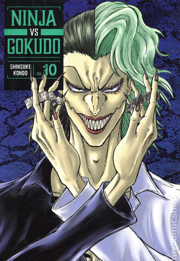 Volume 10 -1st printing. Story and art by Shinsuke Kondo. Since before the dawn of memory, one thing has defined human history: the war between ninjas and yakuzas. This coarse and manly manga follows two members of these warring tribes who fill the gutters of modern Tokyo with blood to determine which elemental force will reign supreme! An outrageous new action series, like Jojo's Bizarre Adventure meets Fist of the North Star! A Reversal of Fortune. Thanks to the prowess of the ninja, the Eight Gokudo of Destruction are now down to five. Determined to avenge the three comrades who perished, Kiwami declares a full-scale war—and this time, the yakuza just might have the advantage. Devastated over losing his one true friend, Shinoha becomes weaker, leaving the Eight Imperial Ninja vulnerable. Now that Kiwami and Shinoha are sworn enemies who must kill each other, is their friendship doomed forever? The revolution begins. Softcover, 6-in. x 8-in., 192 pages, B&W. Older Teen 16+ Cover price $13.99.
