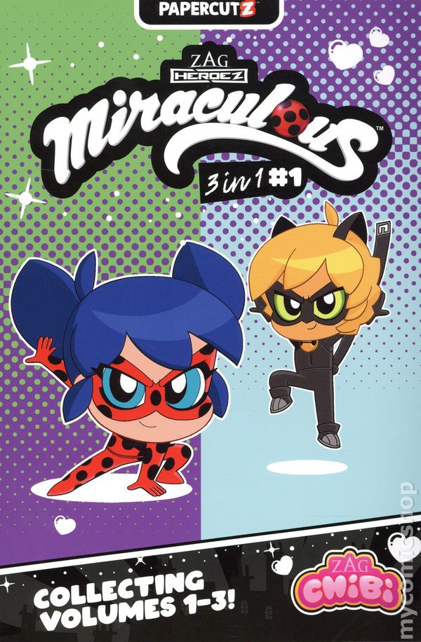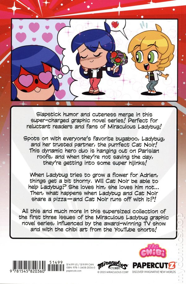 Volume 1 - 1st printing. Written by Josh Trujillo and Carrie Harris. Art by Ryan Jampole, Lex Hobson, Brenda Hickey, and Mauro Fonseca. Cover by Ryan Jampole. Spots on with everyone's favorite bugaboo, Ladybug, and her trusted partner, the purrfect Cat Noir. This dynamic hero duo is hanging out on Parisian roofs and, when they're not saving the day, they're getting into some super hijinks! When Ladybug tries to grow a flower for Adrien, things get a bit thorny. Will Cat Noir be able to help Ladybug? She loves him, she loves him not… Then, what happens when Ladybug and Cat Noir share a pizza - and Cat Noir runs off with it?! All this and much more in this supersized collection of the first three issues of the Miraculous Ladybug graphic novel series, influenced by the award-winning TV show and with the chibi art from the YouTube shorts! Softcover, 6-in. x 9-in., 160 pages, full color. Middle Grade Cover price $14.99.