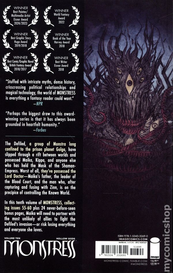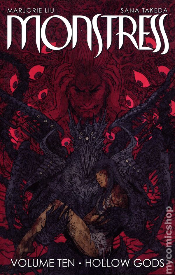 Volume 10 - 1st printing. "Hollow Gods!" Collects Monstress (2015 Image) #55-60. Written by Marjorie M. Liu. Art and cover by Sana Takeda. The Defiled, a group of Monstra long confined to the prison planet Golga, have slipped through a rift between worlds and possessed anyone who has ever held the Mask of the Shaman-Empress--including Maika, Kippa, and Maika's father, the Lord Doctor. Without Zinn at her side, Maika will need to partner with the most unlikely of allies to fight this invasion--or risk losing everything and everyone she loves. Softcover, 184 pages, full color. Mature Readers Cover price $16.99.