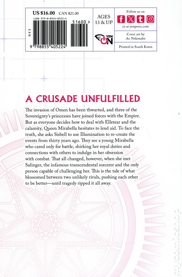 Volume 15 - 1st printing. Written by Kei Sazane. Art and cover by Ao Nekonabe. Translated by Jan Cash. The invasion of Omen has been thwarted, and three of the Sovereignty's princesses have joined forces with the Empire. But everyone decides what to do about the witches and the Calamity, Queen Mirabella hesitates to lend her aid. In order to face the truth, she asks Sisbell to use Illumination to recreate the past from thirty years ago... Softcover, 5-in. x 8-in., 224 pages, Text (with B&W Chapter Illustrations). Ages 13&Up Cover price $16.00.