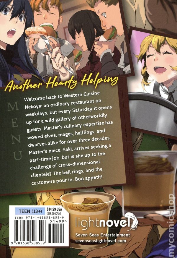 Volume 6 - 1st printing. Written by Junpei Inuzuka. Art and cover by Katsumi Enami. Transalted by Elliot Ryouga. Adapted by Rebecca Schneidereit. ANOTHER HEARTY HELPING. Welcome back to Western Cuisine Nekoya: an ordinary restaurant on weekdays, but every Saturday it opens up for a wild gallery of otherworldly guests. Master's culinary expertise has wowed elves, mages, halflings, and dwarves alike for over three decades. Master's niece, Saki, arrives seeking a part-time job, but is she up to the challenge of cross-dimensional clientele? The bell rings, and the customers pour in. Bon appetit! Softcover, 5-in. x 8-in., 256 pages, Text (with B&W Chapter Illustrations). Rated T Cover price $14.99.