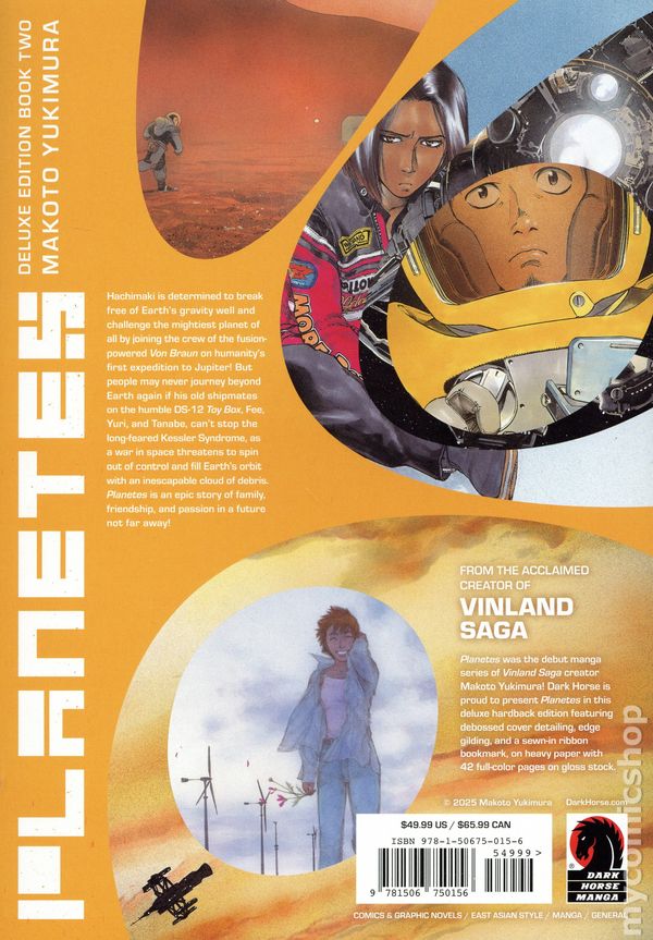 Volume 2 - 1st printing. Story and art by Makoto Yukimura. From manga icon Makoto Yukimura, the creator of Vinland Saga! It's 2078, and eighteen astronauts represent all humanity on its first voyage to Jupiter. And their humanity is more precious than the treasure they seek. Hachimaki is determined to break free of Earths gravity well by joining the crew of the fusion-powered Von Braun on its epic first crewed journey to Jupiter. If the giant planet can be successfully reached and harvested for the helium-3 fuel in its atmosphere, the entire solar system will open up to humanity. But it isnt only worlds whose paths are made by unseen orbits through time and space…its people, and Hachimaki must confront the tension of tightening his human bonds to Earth through marriage, even as he seeks the far frontier—just as his old captain, Fee Carmichael, must seek that invisible balance of forces with the past, present, and future generations of her own earthbound family. And if Fee and crewmates Yuri and Tanabe aboard the space junk removal ship Toy Box cant stop the long-feared Kessler Syndrome as a war in space threatens to spin out of control and fill orbit with an inescapable cloud of debris, humanity may never journey beyond Earth again! Planetes is an epic saga of family, friendship, and passion in a future not far away! Planetes is the ancient Greek word for wanderers—describing both the planets themselves, and the restless protagonists who dream of reaching those distant worlds against an epic backdrop of family, romance, politics, ambition, and war in creator Makoto Yukimuras saga of the human drama of space exploration! Deluxe Edition features: Front and back covers feature debossed patterns with tactile effect. Metallic copper gilding on page edges. 7 x 10 hardback on high-quality paper. 44 full-color art pages on special gloss stock. Book design pays tribute to real astronauts; inspired by elements of the International Space Station. Hardcover, 7 1/2-in. x 10-in., 672 pages, PC/PB&W. Cover price $49.99.