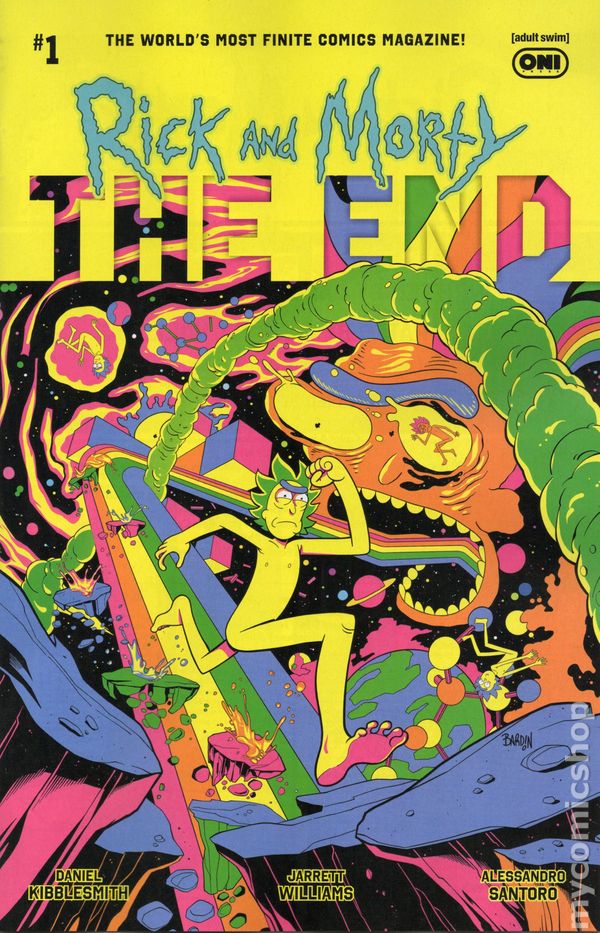 Limited 1 for 50 Retailer Incentive Variant Cover.(W) Daniel Kibblesmith (A) Jarrett Williams (CA) Dave Bardin OUT OF THE SMOKING RUINS OF RICK AND MORTY VS. THE UNIVERSE (ON SALE NOW!!!)—AN ALL-NEW, MEGA-IMPORTANT MILESTONE FOR THE OMNIVERSE’S MOST DYSFUNCTIONAL PAIR OF SCIENCE ADVENTURERS STARTS NOW! Rick Sanchez, the most wanted man in this and every other universe, is on the run. With a bounty on his head, every government, military, pirate, mobster, bounty hunter, bail bondsman, religious institution, theater troupe, circus clown, and endangered species is on the hunt to bring in Rick—DEAD OR ALIVE. The only one who can bring Rick in warm is the one person who knows him best: Morty Smith. But Morty’s not the only Smith hot on Rick’s trail . . . Beth Smith is determined to bring Rick in, and she doesn’t particularly care how. Now it’s just a question of who can get to him first! Cosmic annihilators Daniel Kibblesmith (Loki) and Jarrett Williams (Speed Force) continue their epic re-evolution of Rick and Morty in a brand-new limited series with epic repercussions for what’s coming next! Cover price $4.99.