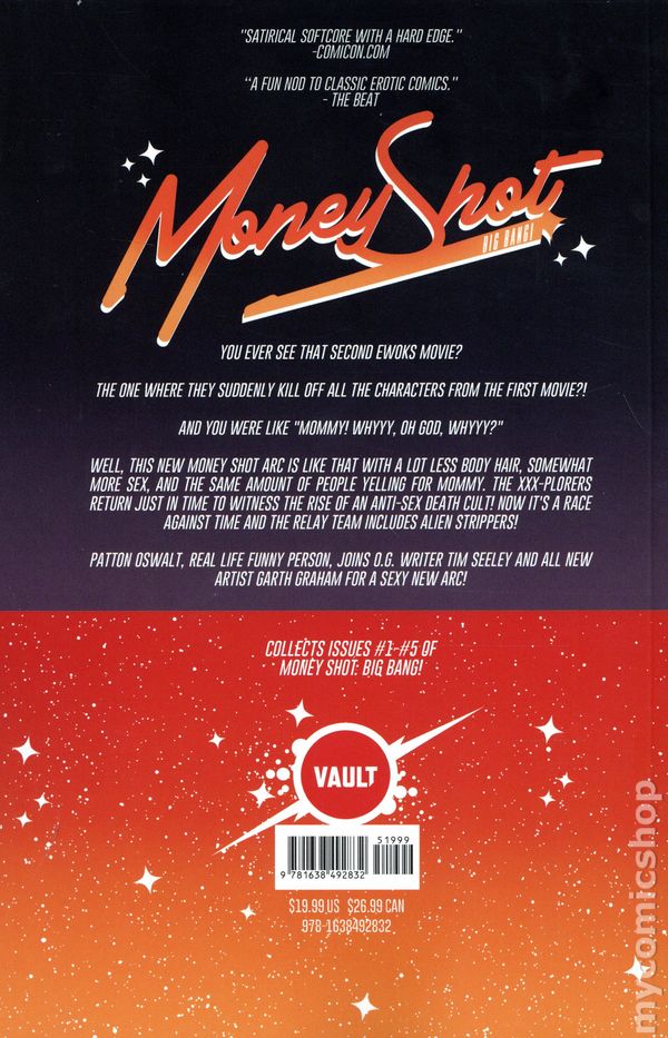 Volume 5 - 1st printing. Collects Money Shot: Big Bang (2025 Vault Comics) #0-4. Written by Tim Seeley and Patton Oswalt. Art and cover by Garth Graham. Patton Oswalt and Garth Graham join Tim Seeley for the funniest and naughtiest arc of Money Shot yet! The XXX-plorers must stop an anti-sex despot from ruining the universe. In a race against time itself, our heroes must convince a lonely outsider named Azi Wynorski that getting naked with friends is good before he can become an incel tyrant. Softcover, 128 pages, full color. Mature Readers Cover price $19.99.