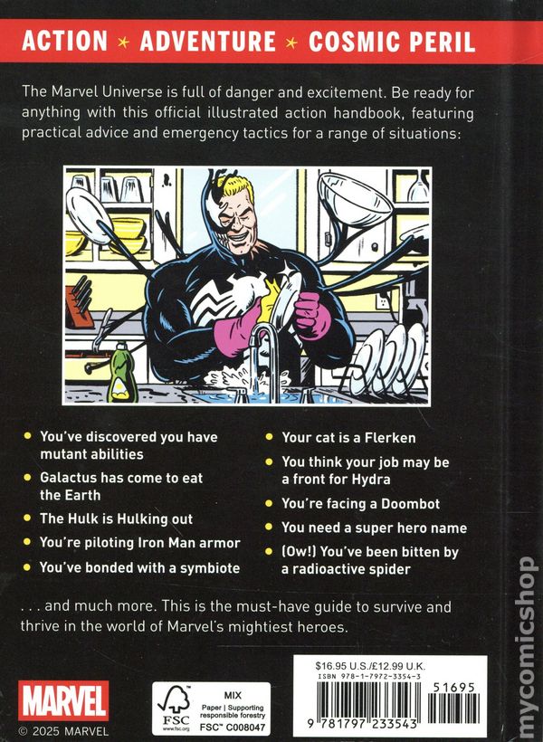1st printing. Written by Daniel Kibblesmith. Art and cover by Kyle Hilton. The Marvel Comics Universe is full of action, adventure, danger, and cosmic peril. Be ready for anything with this illustrated action handbook—whether you have newly developed super-powers, you need to pilot an Iron Man suit, or Galactus is here to eat the Earth.Written by Marvel Comics and Emmy-nominated humor writer Daniel Kibblesmith, this official illustrated guide to surviving and thriving in the Marvel Universe uses comics-tested advice to steer readers through what to expect when exposed to gamma rays, bonding with a symbiote or—ow!—feeling an unexpected sting at the science fair. Featuring practical information such as wall-crawling tips, along with emergency information (youve been plunged into the Quantum Realm) and day-to-day guidance if your cat turns out to be a Flerken, you suspect someone of being a Skrull, or are facing a doombot, this is the must-have handbook as you live in the world of Marvels mightiest heroes. Hardcover, 5-in. x 7-in., 128 pages, full color. Cover price $16.95.