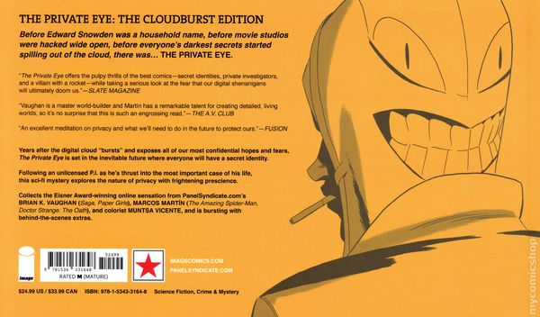 1st printing. Written by Brian K. Vaughan. Art and cover by Marcos Martin. From the critically acclaimed co-creators behind PanelSyndicate.com, writer BRIAN K. VAUGHAN (SAGA, SPECTATORS) and artist MARCOS MARTÍN (FRIDAY, BARRIER), comes the Eisner Award-winning sensation THE PRIVATE EYE, available for the first time ever in a gorgeous new paperback edition. Set in an inevitable future of where everyone has a secret identity, THE PRIVATE EYE is an eerily prescient sci-fi mystery about an unlicensed private investigator who stumbles onto the most important case of his life. The series is set in 2076, a time after "the cloud has burst", revealing everyone's secrets. As a result, there is no more Internet, and people are excessively guarded about their identity, to the point of appearing only masked in public. Softcover, 10 1/2-in. x 7 1/2-in., 300 pages, B&W. Cover price $24.99.